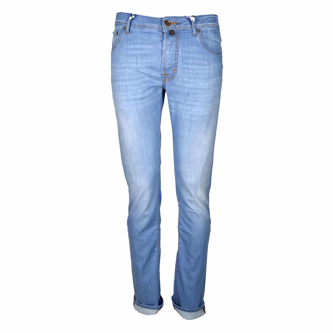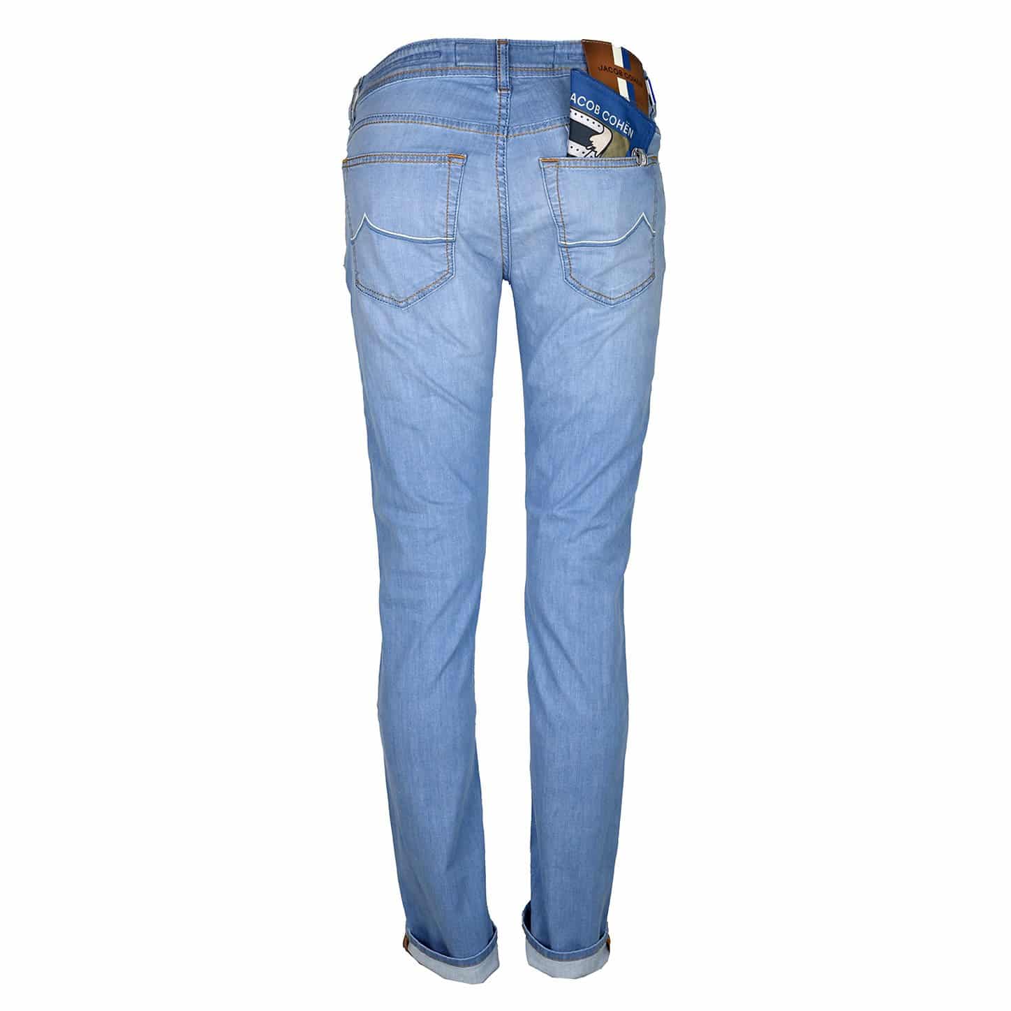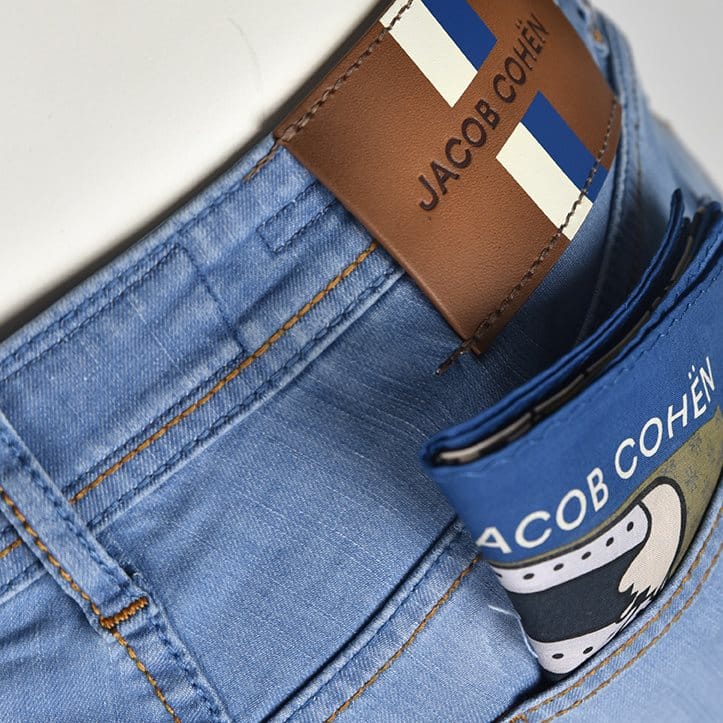 Jacob Cohen jeans model BARD uit de S/S’25. Patch is van leer en inspired by LV.