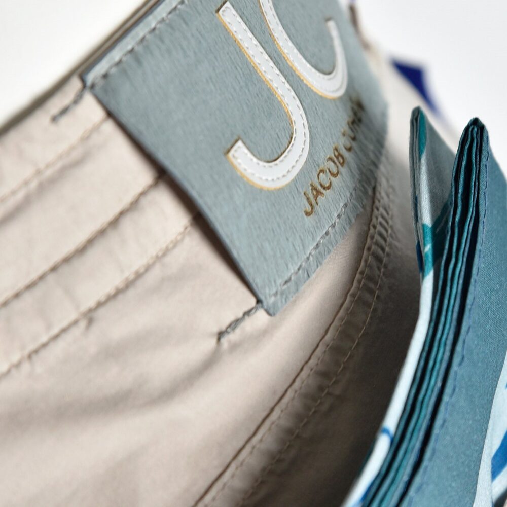 Jacob Cohen model Pharrel uit de S/S 2023 collectie.Dit model heeft steekzakken en een draw string
